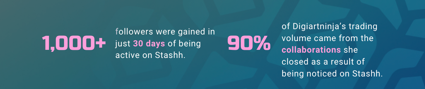 Her approach was relentless and highly visible on the Stashh platform (especially in the Feed), leading to exponential growth, collaborations with notable NFT groups, and ultimately her feature as the "Stashh of the Day," which dramatically increased her followers.