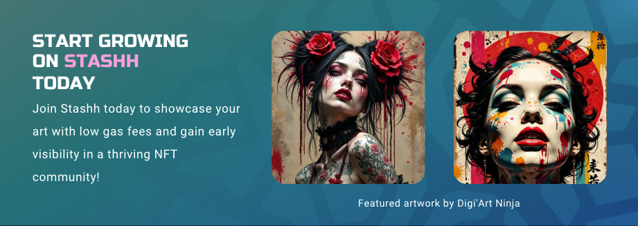 Digi'Art Ninja (Digi) is a multifaceted artist with expertise in physical, digital, and AI art. She quickly grew her presence on Stashh by leveraging the platform’s low fees, unique features, and active engagement strategies. Within a few months, she amassed over 1,200 followers and secured valuable collaborations, significantly boosting her visibility and financial success. Her consistency, creativity, and strategic use of Stashh's tools played a key role in her rapid growth and recognition in the NFT community.